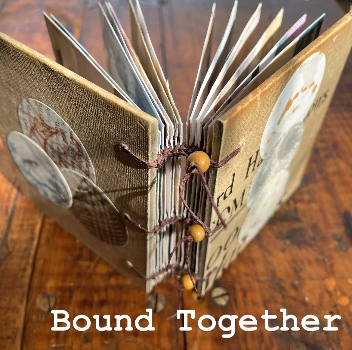 In this weekend retreat and workshop, attendees will create a handmade, one-of-a-kind book with 26 small collages (on 13 double-sided pages), bound together with a slipknot binding, between vintage book covers. We will focus on creating an open, non-judgmental, creative atmosphere together.